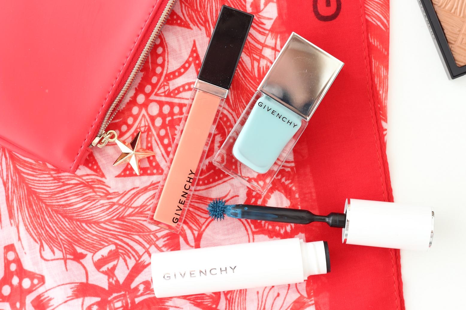 Van links naar rechts: Givenchy Poudre Bonne Minne in 3 Ambre Croisière - Gloss Interdit in 37 Secret Nude - Phenomen'Eyes Waterproof in Croisière Lagon - Mister Radiant Visage - Le Vernis in Croisière Aquatique